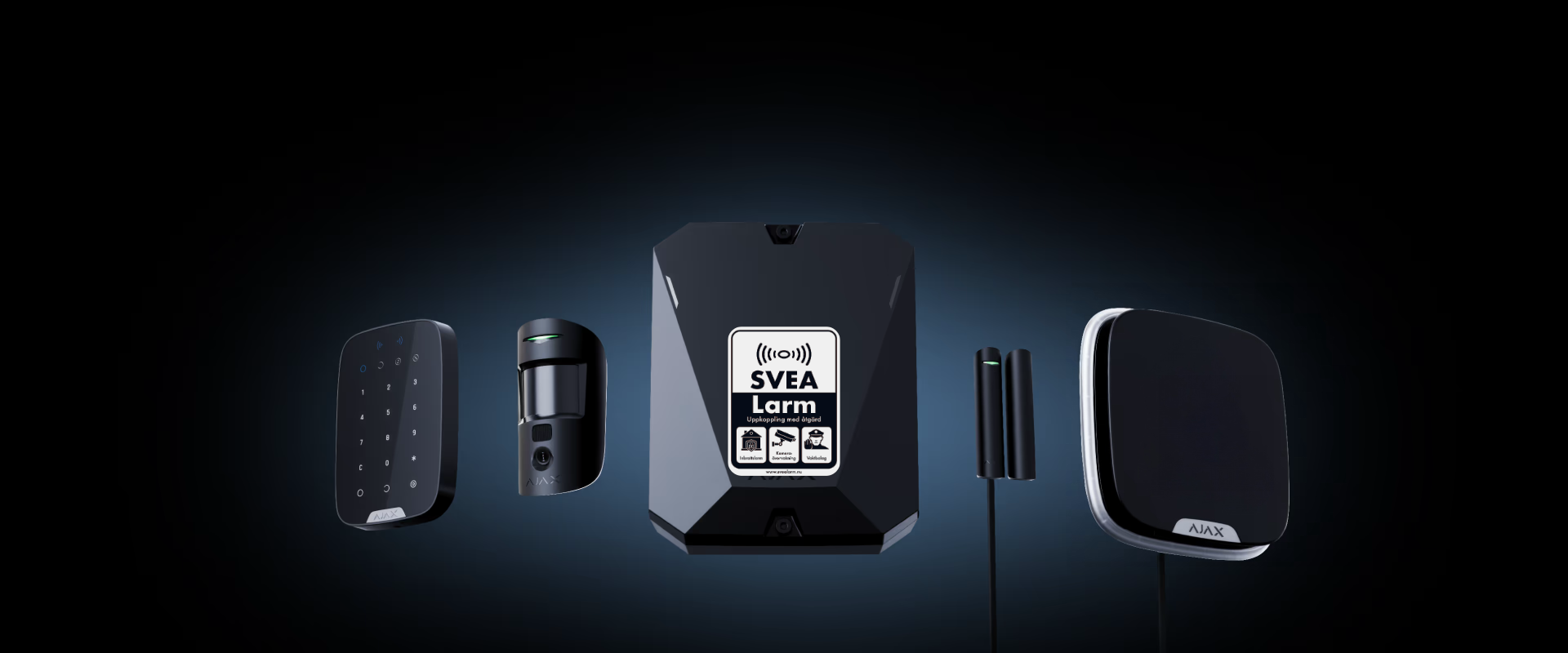 Med smart teknik erbjuder vi lösningar för alla behov. Standardpaketet innehåller centralenhet, dörrsensor, rörelsedetektorer och siren – du kan självklart bygga ut med fler sensorer.