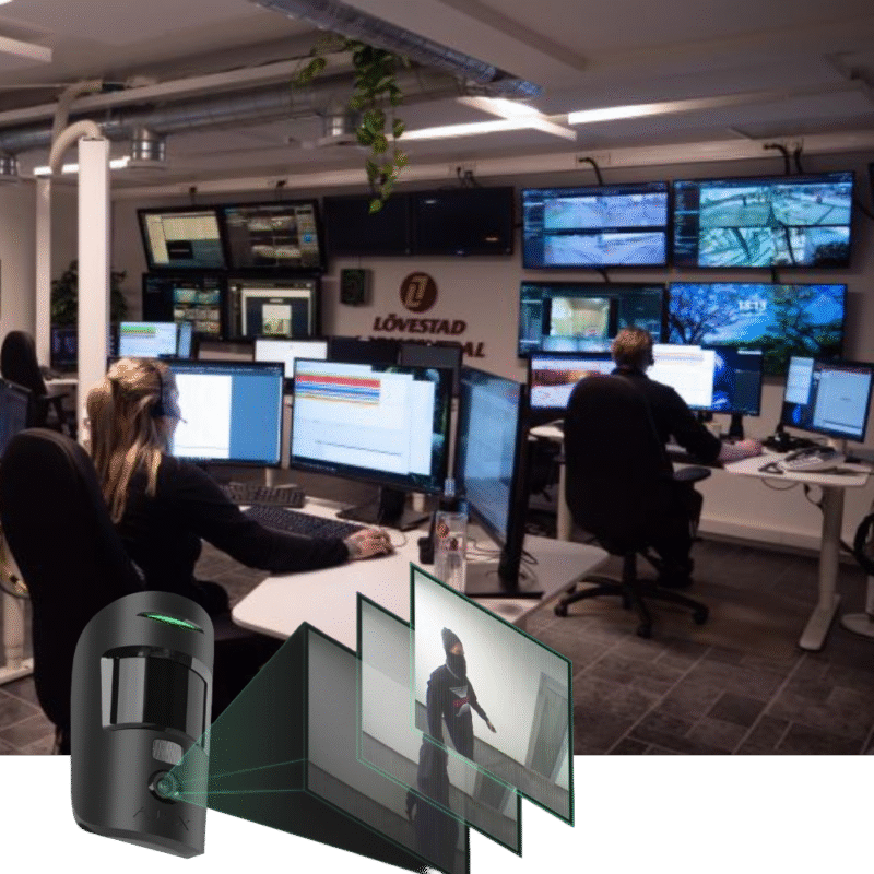 När ett larm bekräftas triggas åtgärder omedelbart – exempelvis siren, avskräckande funktioner, väktarutryckning eller kontakt med räddningstjänst för snabb insats.
